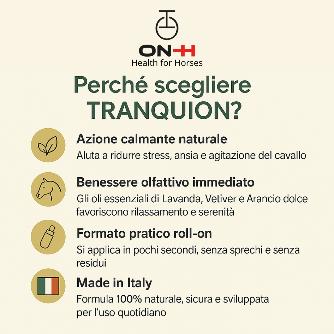 TranquiON è un roll-on naturale da 50 ml studiato per aiutare i cavalli nei momenti di stress o agitazione.